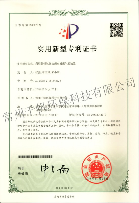 實用新型專利證書 利用芬頓氧化處理有機(jī)廢氣的裝置